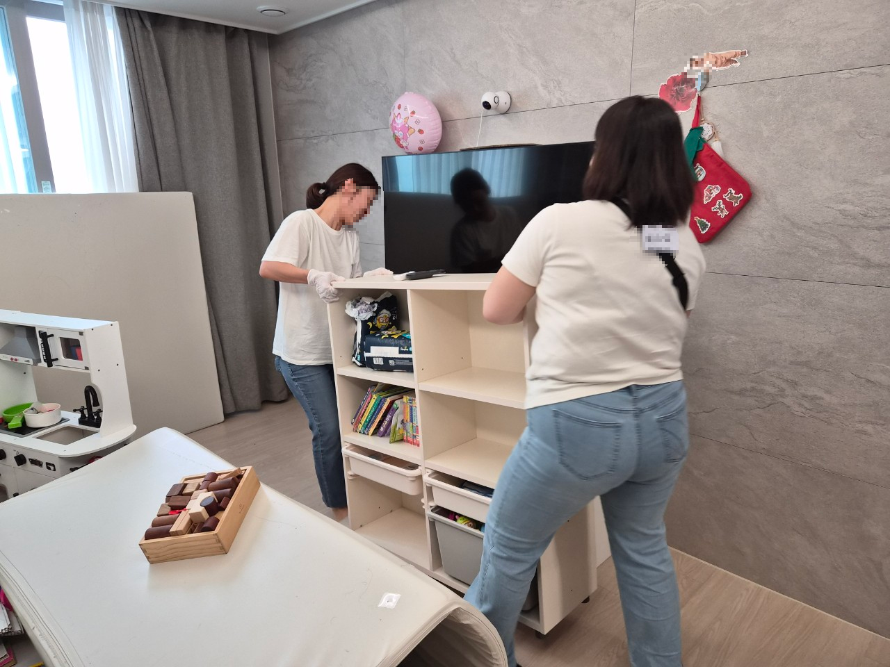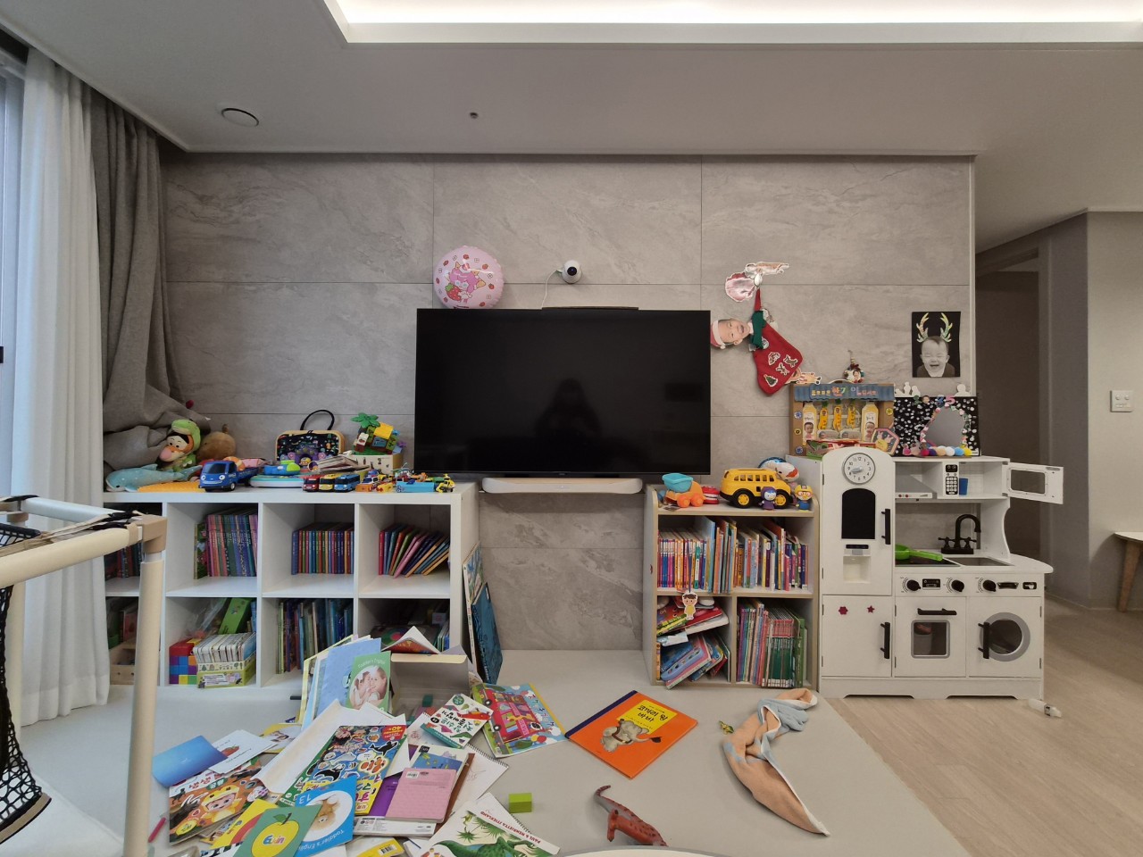 주방놀이를 이동하고 아이 장난감과 책을 한 번에 정리할 수 있게 가구 배치를 하니 훨씬 안정감 있는 거실이 되었죠?