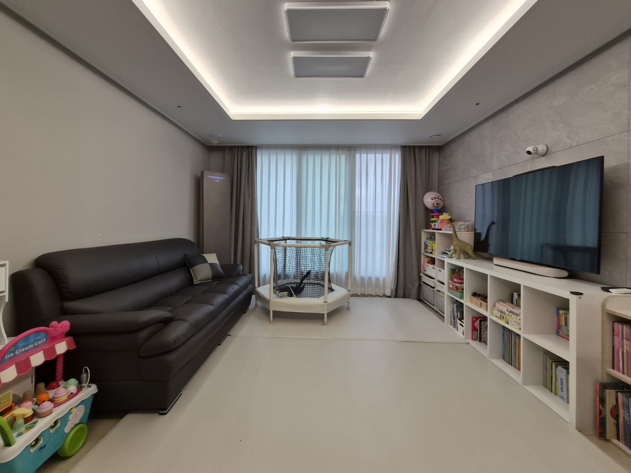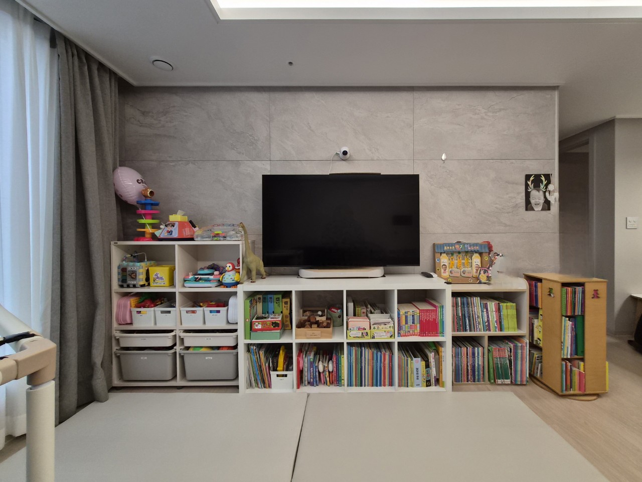 주방놀이를 이동하고 아이 장난감과 책을 한 번에 정리할 수 있게 가구 배치를 하니 훨씬 안정감 있는 거실이 되었죠?
